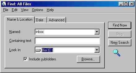 Illegal operations in Microsoft Mail Programs generally occur when one of the mailboxes (usually the inbox or the outbox) become corrupt. If this error message occurs immediately after entering the mail program the problem is probably your inbox. If the problem occurs immediately after doing a send and receive the problem is probably your outbox.  To fix your Inbox go ahead with the following instructions, to fix your outbox simply replace any instance of inbox with outbox.  To fix Outlook Express click on the start button, go to find and then files and folders and your screen should look like this.